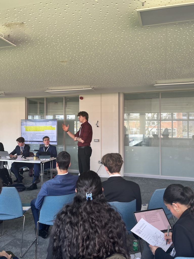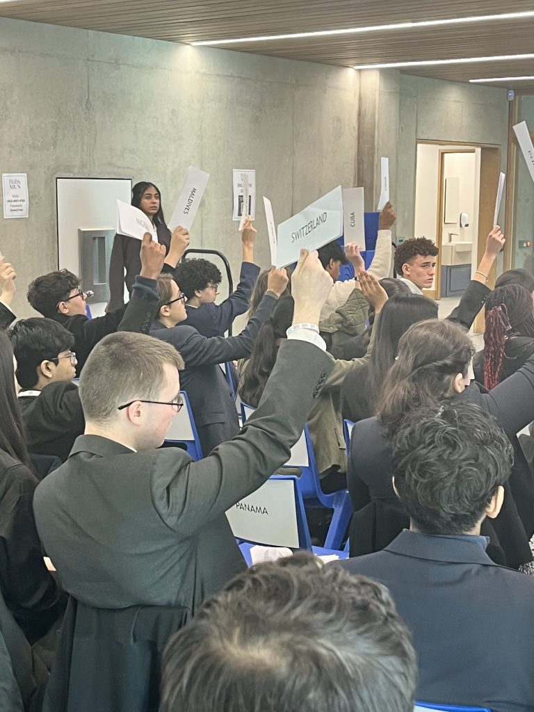 As soon as we arrived, we got straight into it at pace! First, a stunning experience was witnessed as we entered Bourne Hall’s prestigious auditorium. Complete with live music and beautiful decoration, hundreds of delegates mingled diplomatically before being escorted to committee rooms to start the debate.